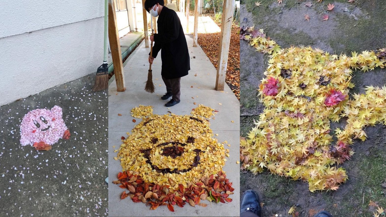 🍂 Utilisant les teintes vives du feuillage d'automne, il arrange précisément les feuilles pour mettre en forme des personnages tels que Pikachu, Kirby et Winnie l'Ourson, apportant ainsi une touche de fantaisie et d’imagination dans l'enceinte de l'école.