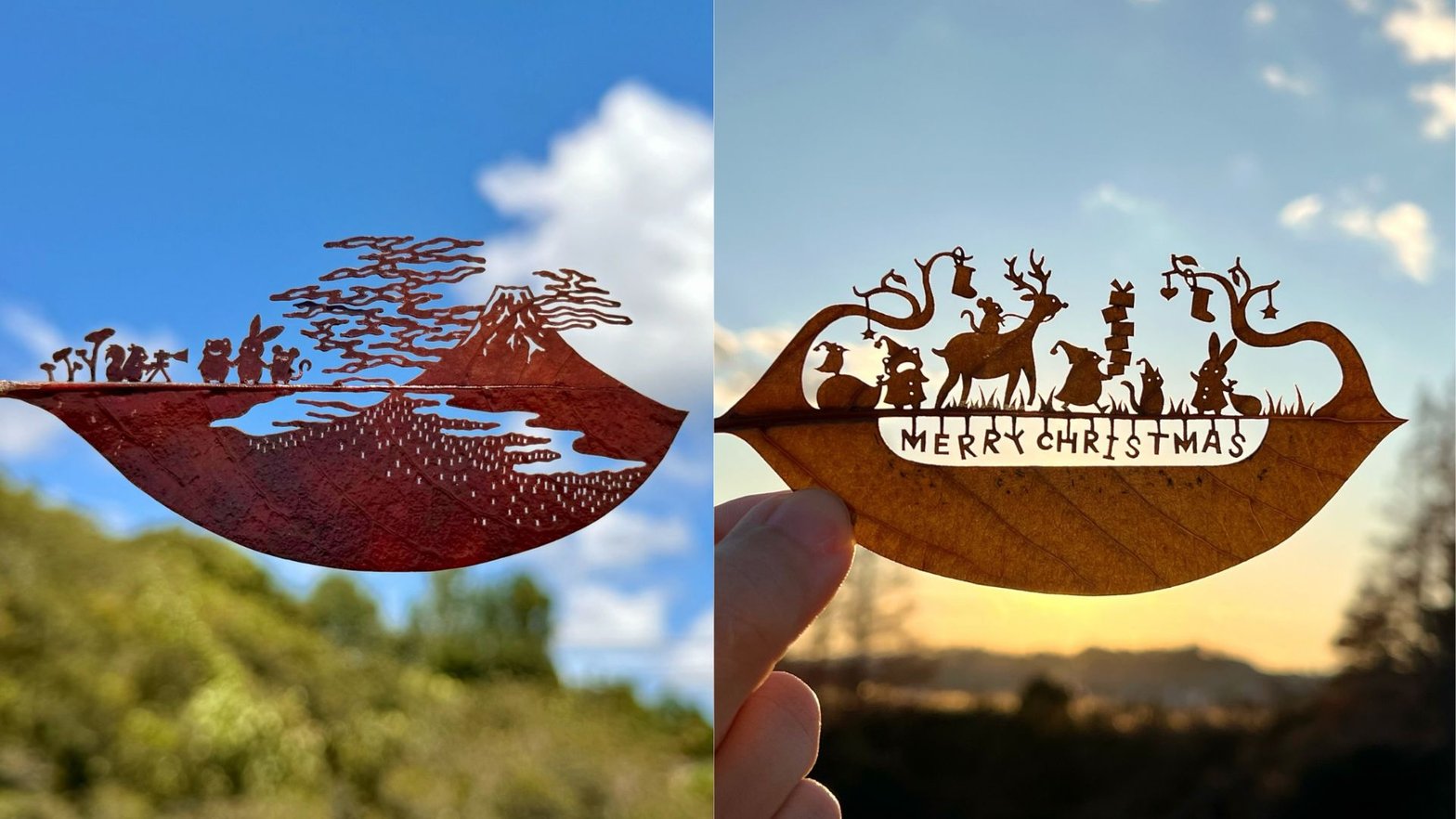 🎨 Chaque feuille devient une toile délicate où prennent vie des scènes d’une minutie saisissante. Entre ombre et lumière, il joue avec la transparence et la texture végétale pour donner à ses créations une dimension presque magique.